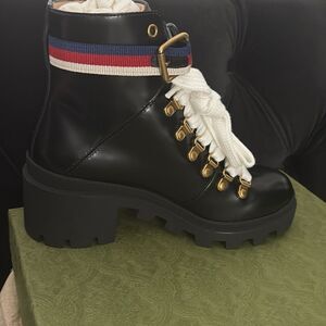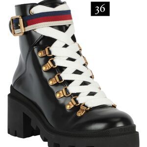Brand new women's Gucci boots size 5 and 6 step out in style with these chic black leather boots from Gucci. Featuring a bold design with white laces and gold accents, these boots are perfect for making a statement. Comes with box and dustbags