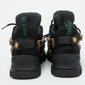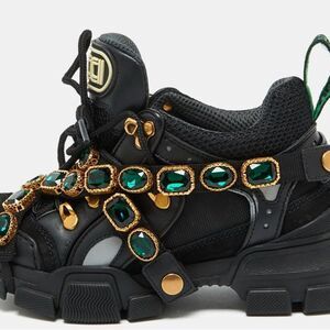Brand new women's size 7.5 Gucci Black Mesh and Leather Flashtrek Reflective Removable Crystals SneakersStylish and comfortable, these Gucci sneakers feature a striking black design with gold embellishments. Perfect for adding a touch of luxury to any outfit.