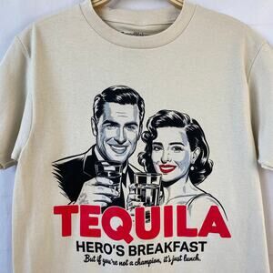 BrandMakers Men's Y2K Retro Graphic short sleeve Tee T-shirt in cream color with a pop of color of a Tequila Hero's Breakfast print - NEW