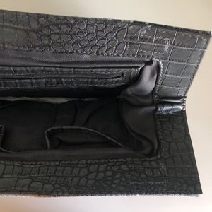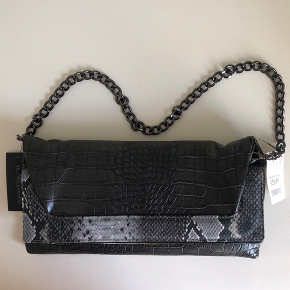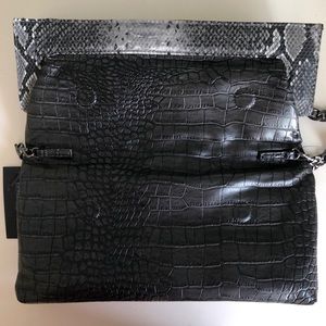 Faux-leather python-printed fold bag with metal chain, magnetic opening & deep pocket; minor discoloration near opening