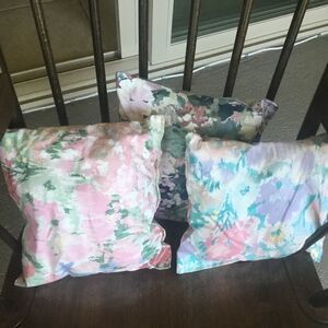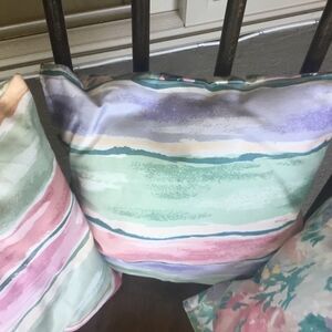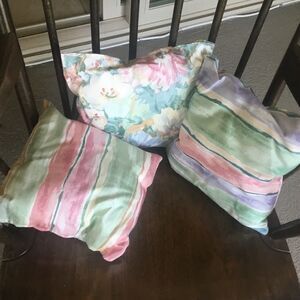 Handmade set of 3 pillows in florals and stripes in pastel pinks, greens, blues and purples. Made of all new cotton/polyester fabrics in a smoke free home.