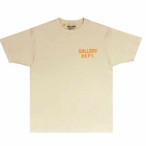 Cream t-shirt featuring bold orange 'Gallery Dept.' print on the back.