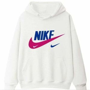 Classic white Nike hoodie. Features vibrant pink and blue logo. Perfect for casual wear.