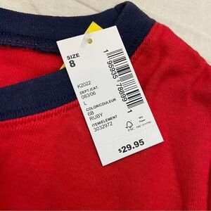 Long sleeved red shirt with blue trim detail and Tree-Rex graphic