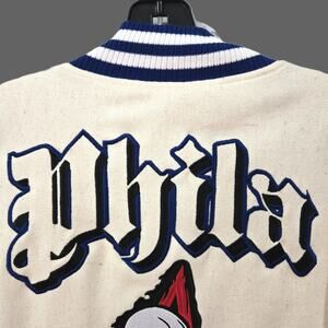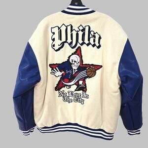 Stand out with this BrandX Philly Distressed Varsity Jacket & Jersey Set in size XL, designed with bold graphics and premium construction. This statement piece pays tribute to Philadelphia with standout embroidered and appliqué details, including “City of Brotherly Love” and “Phila” lettering, star patches, and skull-inspired artwork.