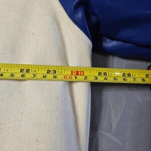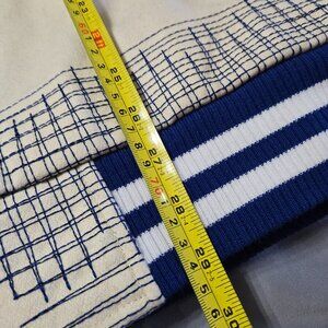 Colorway: Cream body with royal blue sleeves and striped ribbed trim
