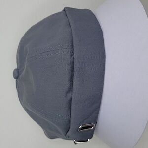Gray, 100% Cotton docker hat made by Branded Bills in One Size. "b." logo on the front. Rolled brim with an adjustable faux leather strap in the back. This neutral and trendy staple is perfect for year-round wear. It can easily be folded without loosing it's shape making it great for on the go travel. There are multiple places of discoloration on the right side of this hat (last 3 pictures). There is also a distinct color difference between the area under the folded part and the top of the hat (picture 7). But overall, this hat still has a lot of life left in it!