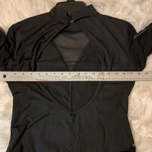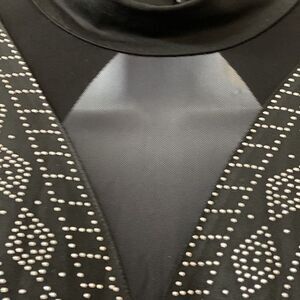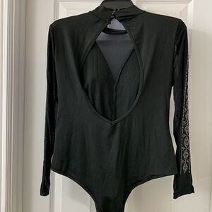 Branded size large front and sleeve sequined black bodysuit. NWOT & Smoke free & Pet free home. See photos for complete description/details.