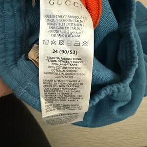 Brand new kids Gucci size 24 months us size 2 2 Experience ultimate comfort and style with these Gucci sweatpants, featuring a striking blue base complemented by bold side stripes. Crafted for a relaxed fit, these joggers are perfect for casual outings. The soft fabric ensures a cozy feel for child versatile addition to their wardrobe.