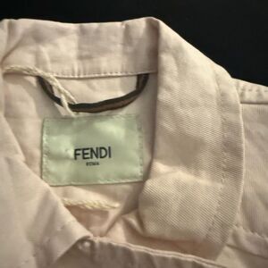 This elegant Fendi coat in a delightful pink hue features a classic double-breasted design and a collared neckline. Its lightweight fabric and relaxed fit make it an ideal choice for spring or summer outings for ur baby offering both style and comfort.