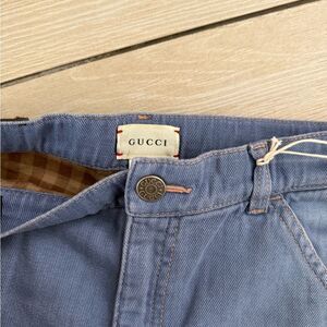 Brand new kids Gucci size 8 Jeans. Experience the perfect blend of style and comfort with these Gucci blue jeans. Featuring a relaxed fit and a unique plaid cuff detail, these jeans offer a classic stonewashed look with a modern twist. Ideal for casual outings, they provide a timeless appeal with their subtle fading and straight-cut design.