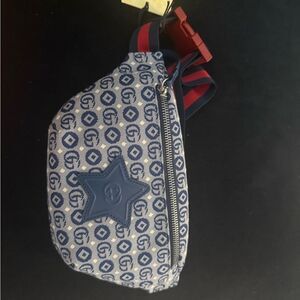 Chic Gucci belt bag with navy and white pattern. Features a bold star accent. Gucci Kids blue and cream canvas belt bag