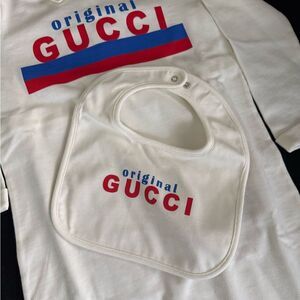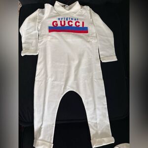 Brand new with box Gucci Jumpsuit with Gucci logo and bib set Features bold red and blue Gg logo comes with box brand new giftable 18/24 months