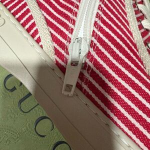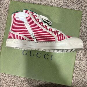 Brand new with box Gucci Kids Striped High-Top Sneakers size 31 us size 13 These Gucci , perfect for making a bold fashion statement. Crafted with a high-top design, they offer both style and comfort for everyday wear. The sneakers feature a durable rubber sole and a sleek, modern aesthetic.red multicolor Gucci canvas high top sneakers with rubber soles, round toes and lace closure at top. Designer size 31 box i and dustbag included