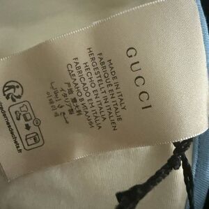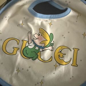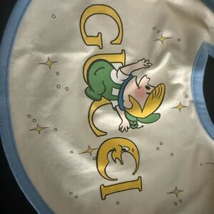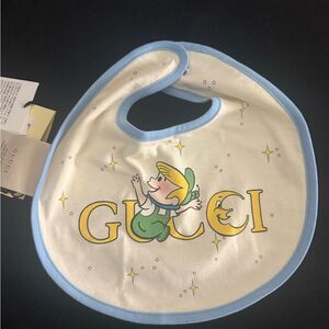 This charming Gucci bib is crafted in a soothing cream color, highlighted by a soft blue trim. Designed for comfort and style, it ensures your little one stays clean while adding a touch of elegance to their outfit.