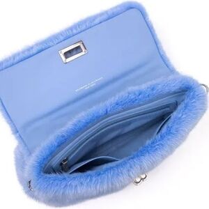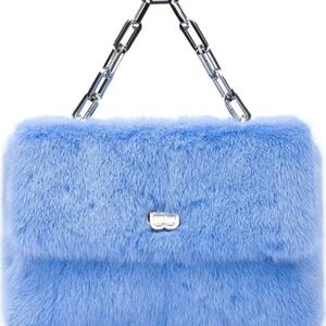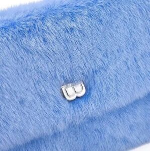 Luxurious blue fur bag. Features a striking silver chain. Perfect for stylish outings. This bag is sold out on the sight but can still be seen on BB instagram and social media pages.