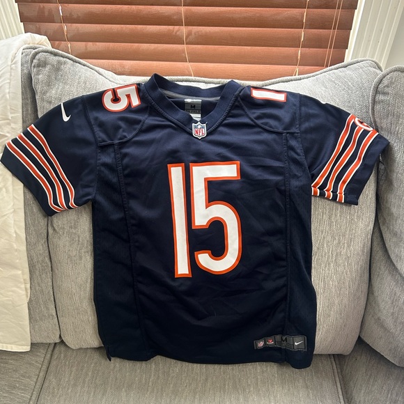 Show your team spirit with this official NFL Chicago Bears jersey, featuring a striking blue and orange color scheme. The jersey boasts the iconic number '15' with orange trim and distinctive striped sleeves, embodying the classic Bears' design. Perfect for any fan, this jersey is a must-have for game day or casual wear.