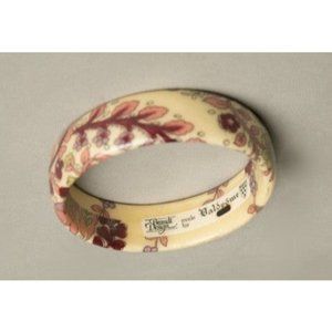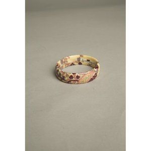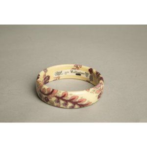 Wonderful floral bangle made of French fabric in the colors of pastel beige with pink and wine maroon accents, labeled "Brandt Design made for Valdrome France"