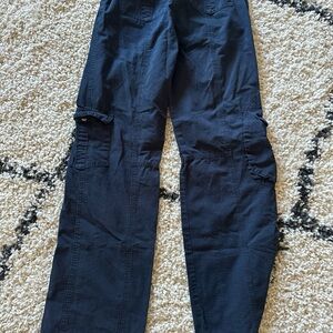 Stylish blue cargo pants. Features multiple pockets. Comfortable fit.