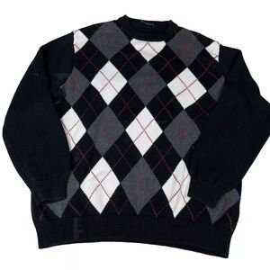 • Features: Classic oversized pullover crewneck argyle sweater with a black, gray, off white and dark red argyle print.