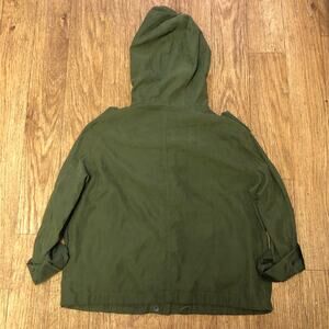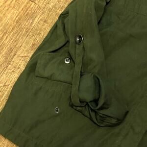 • Other information: Army green utility / military jacket. Hood with drawstrings. Long sleeves. Epaulets at the shoulders. Zipper and button snap closure down the front of the jacket. Two faux chest pockets. Two pockets near the hemline with snap button closure. Sleeves can be held up with the roll up tabs. String to chinch hemline. Please note that there is mild discoloration throughout, but it appears to be intentional in my opinion.