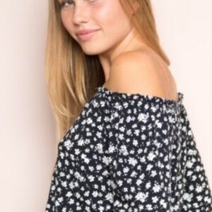 Soft woven cotton off-the-shoulder top in navy and white floral print with elasticized neck, sleeves and waist, cropped fit.