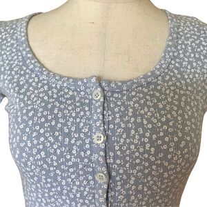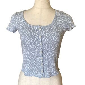 Brandy Melville Blue Floral Button Front Crop Top Short Sleeve Ribbed Stretch