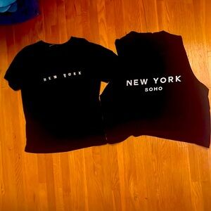 Brandy Melville bundle of two black New York tops. One is a short sleeve tee shirt that says: New York. It is in very good used condition except that Brandy Melville label is loose on one side. The second top is a muscle tee that says: New York SoHo. This top is also in very good used condition except that Brandy Melville label is missing.