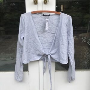 New with tags. Soft and lightweight top in blue and white striped with a crossover wrap and a self-tie in the back. Deep v-neck front, cropped fit. One size fits all