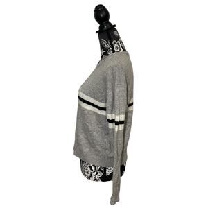 DESCRIPTION: Gently worn long sleeve sweater features wraparound horizontal stripes in black and white on a light gray background.