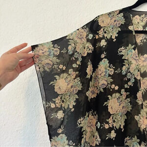 Beautiful, floral, long duster cover-up piece from Brandy Melville. Main color is black with a floral pattern over it, with an open front and short sleeves. Made of a sheath, almost sheer material which makes it perfect for a casual day out in the sun or even as a beach cover-up. Size small, in excellent used condition with no visible flaws.