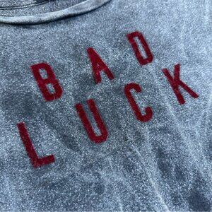 Details: As seen on influencer Madison Beer, Comfy, Lightweight Loose-Fitting Tee. Reads “Bad Luck” in Red velvet velour Lettering. Intentional Worn-In / Distressed Look. Curved hem, rough edges.