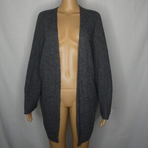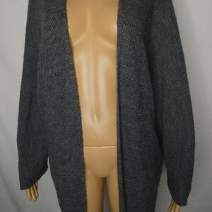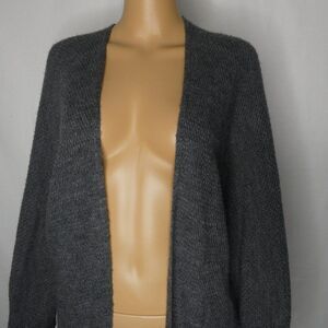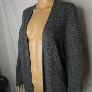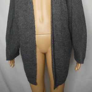 Beautiful wool/acrylic blend open front knit sweater. Solid grey, thinnish threads in a slightly open(when up close) knit. Small white spot and light pilling but still lots of life left!