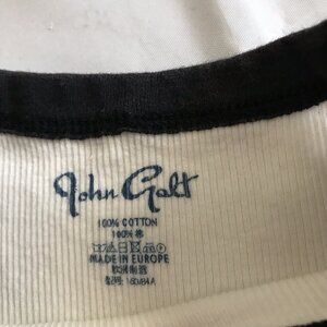 The Brandy Melville John Galt Saint Marks Shirt is a stylish and versatile cotton baby tee designed for women in one size. This top features a classic black and white color scheme, making it easy to pair with any outfit. Made from soft cotton material, this t-shirt is comfortable to wear everyday, whether you're dressing up or down. With its timeless design and quality construction, this shirt from Brandy Melville is a must-have addition to any wardrobe.