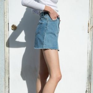 Super cute denim mini skirt perfect for summer! Features a frayed raw hem, belt loops, and zipper closure with a flattering A-line silhouette in the perfect shade of blue. — Size Small — From website: 14.5" length, 26.5" waist — Fits size 25-26 best, sits at waist