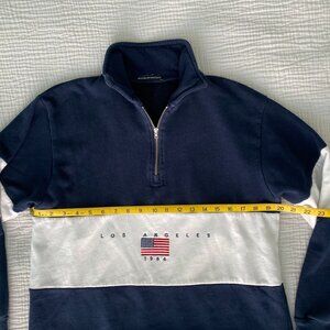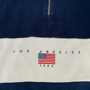 Brandy Melville Los Angeles 1984 Quarter Zip Sweatshirt. Bottom band was cut off to create a raw edge bottom. Gently worn, excellent condition.