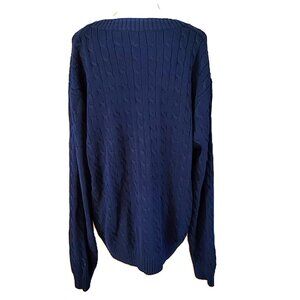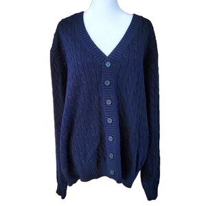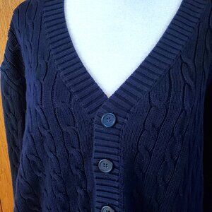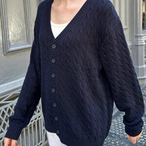 The Brandy Melville Amber Cotton Cable Knit Cardigan Sweater in navy blue features a classic cable-knit design, a V-neck, long sleeves, and full button closure. Made from a blend of cotton and acrylic. With a relaxed, oversized fit, this one-size-fits-most sweater is perfect for casual occasions or travel. See photos for measurements.