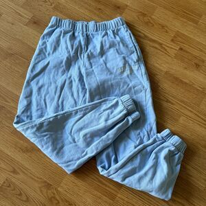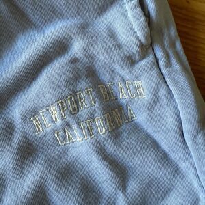 Thick and cozy cotton blend sweatpants in pastel blue with the Newport Beach California embroidery on the left leg with an elastic waistband, side pockets, and elastic cuffs.