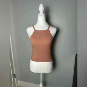 Tags: ribbed tank top brown, sleeveless rib knit top, fitted racerback style tank, casual summer top, lightweight knit tank, neutral basic layering top, minimalistic ribbed shirt, stretchy knit tank, versatile everyday top, cozy ribbed camisole, soft knit racer tank, wardrobe essential layering piece