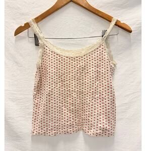 Beige printed cotton tank top with little red hearts and lace neckline and straps.