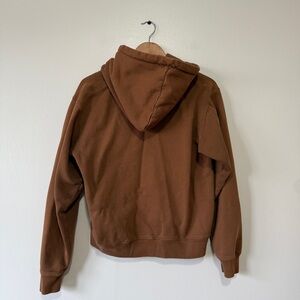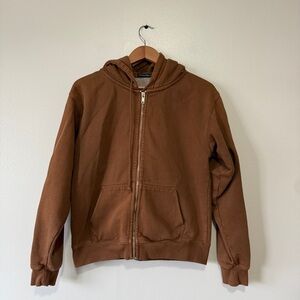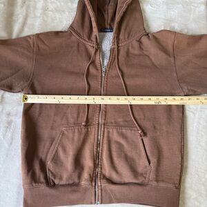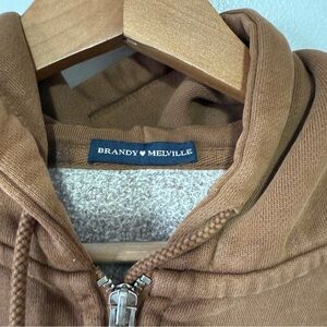 Comfortable tan hoodie. Soft texture. Easy zip closure.