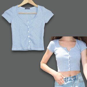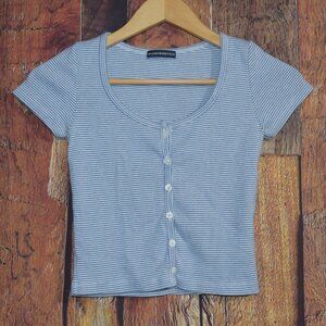 Brandy Melville Women's Blue and White Crop Top Button Down Zelly Shirt