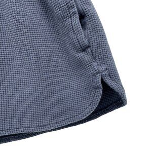 Pull-on style short style shorts - shade of blue. Made of a waffle knit / thermal knit fabric. Elastic & drawstring tie waist. Material has a stretch. 100% Cotton.
