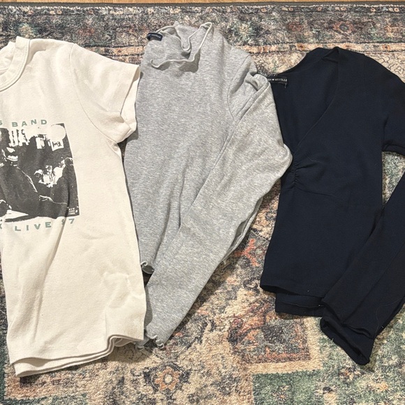 Set of three Brandy Melville tops. Includes cream graphic tee, gray long sleeve, and black long sleeve. Casual and versatile.