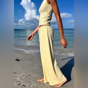 Cozy light weight low rise pajama pants in pastel yellow with a white drawstring and eyelet fabric.