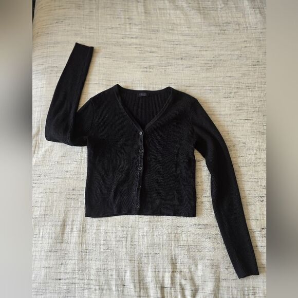 Stylish black ribbed cropped cardigan. V-neck with button closure. Perfect for layering.