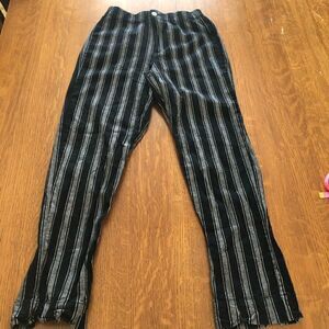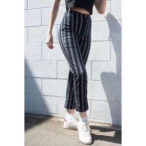 EUC Brandy Melville Tilden Pants. One Size. High-rise trouser pants in black and grey stripes with a button and zipper front, elasticized waistband, faux back pockets and a slit on the back hem. I think the pants look more Blue than Black, but they are listed on the Brandy Melville as black stripes.