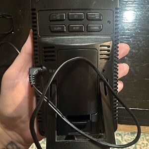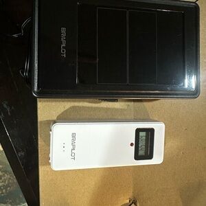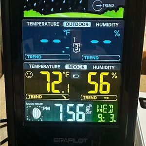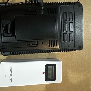 Braplot weather station with a digital display and remote sensor. Features outdoor pressure, moon phase, time and date, indoor and outdoor temperature and humidity. Comes with the outdoor thermostat that you mount. Used for about a month works great. Base can either be plugged in or used off 2 AA batteries.
