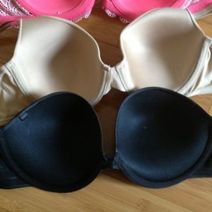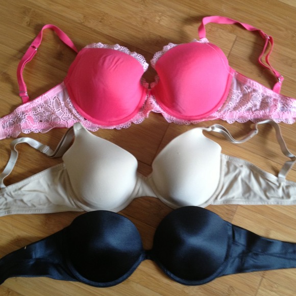 Pink DKNY lace 32DD, Nude bra 34D, black strapless push up 34B. All were never worn. Brand New, just never got to wear.