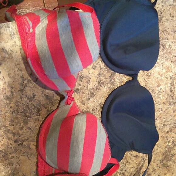 One bra is Navy blue The other bra is gray and pink stripped